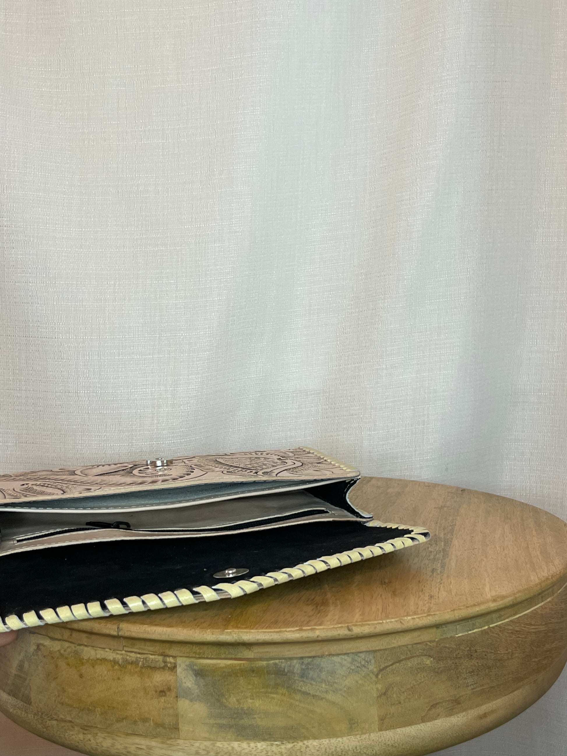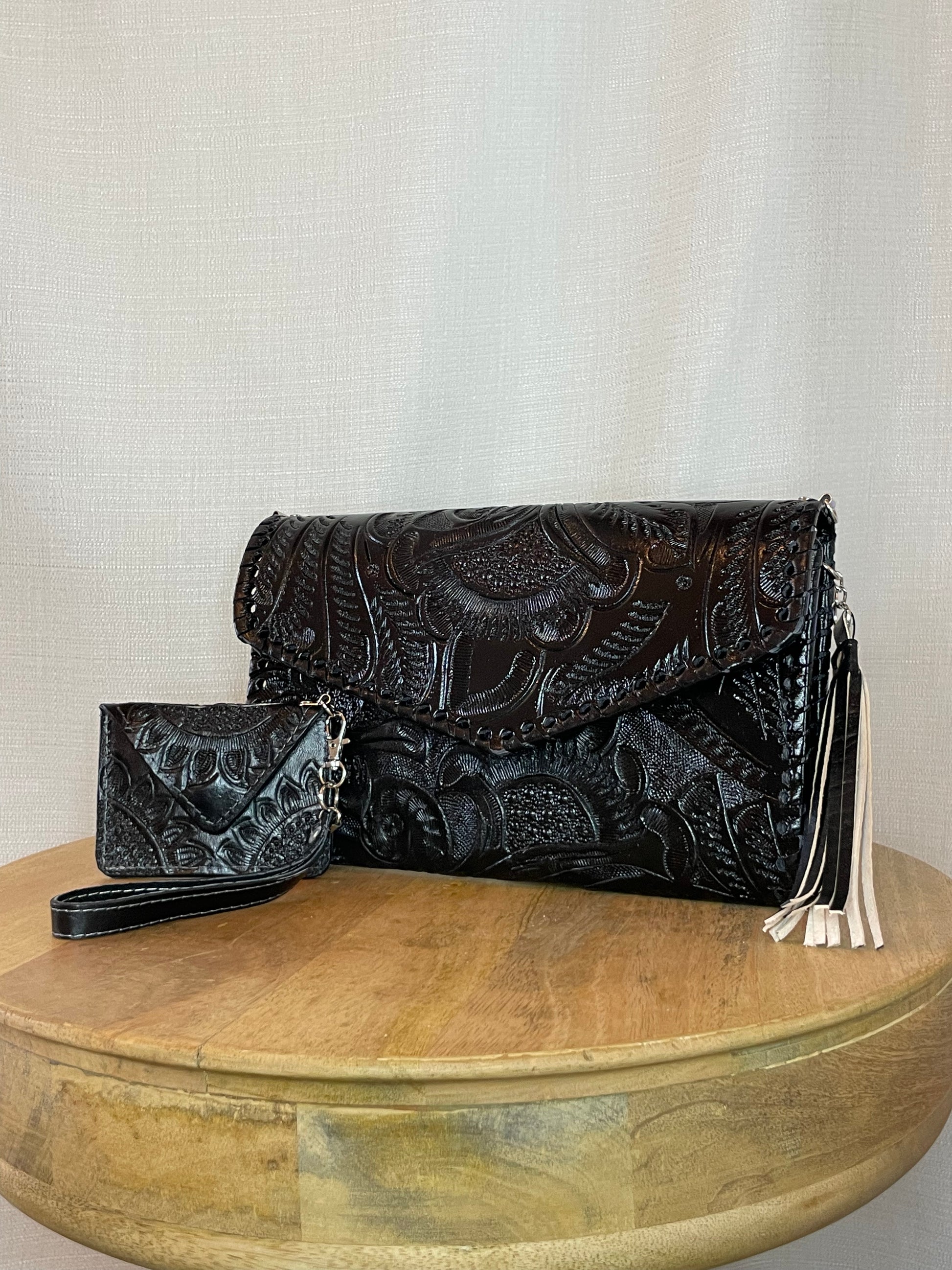Resalta con esta cartera/bolso de mano hermoso de piel/vaqueta. Hecho a mano por artesanos en Guadalajara, Mexico.