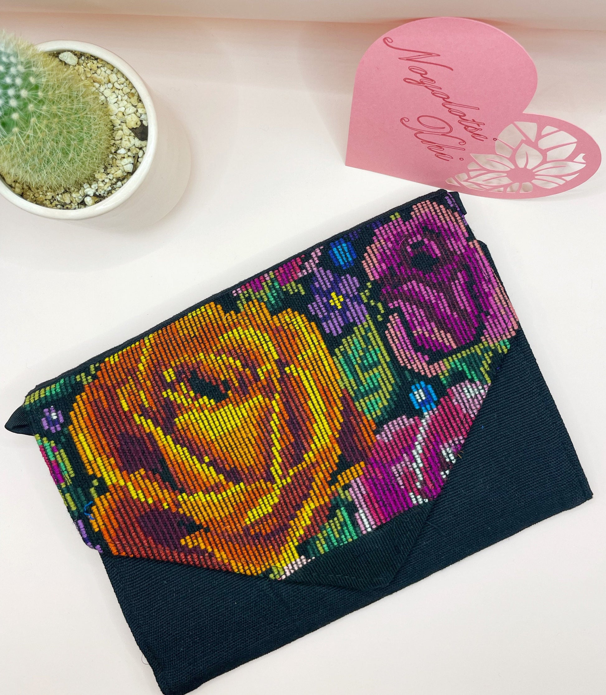 Look stylish and stand out for any occasion or special events. This handmade embroidered (punto cruz) clutch will be your go to accessory. The simple touches, colors, and overall look will catch the eyes of all the right people. Beautiful fabric with one of a kind pattern and beautiful colors and accents. Handmade purse by Mexican artisans from Chiapas, Mexico.