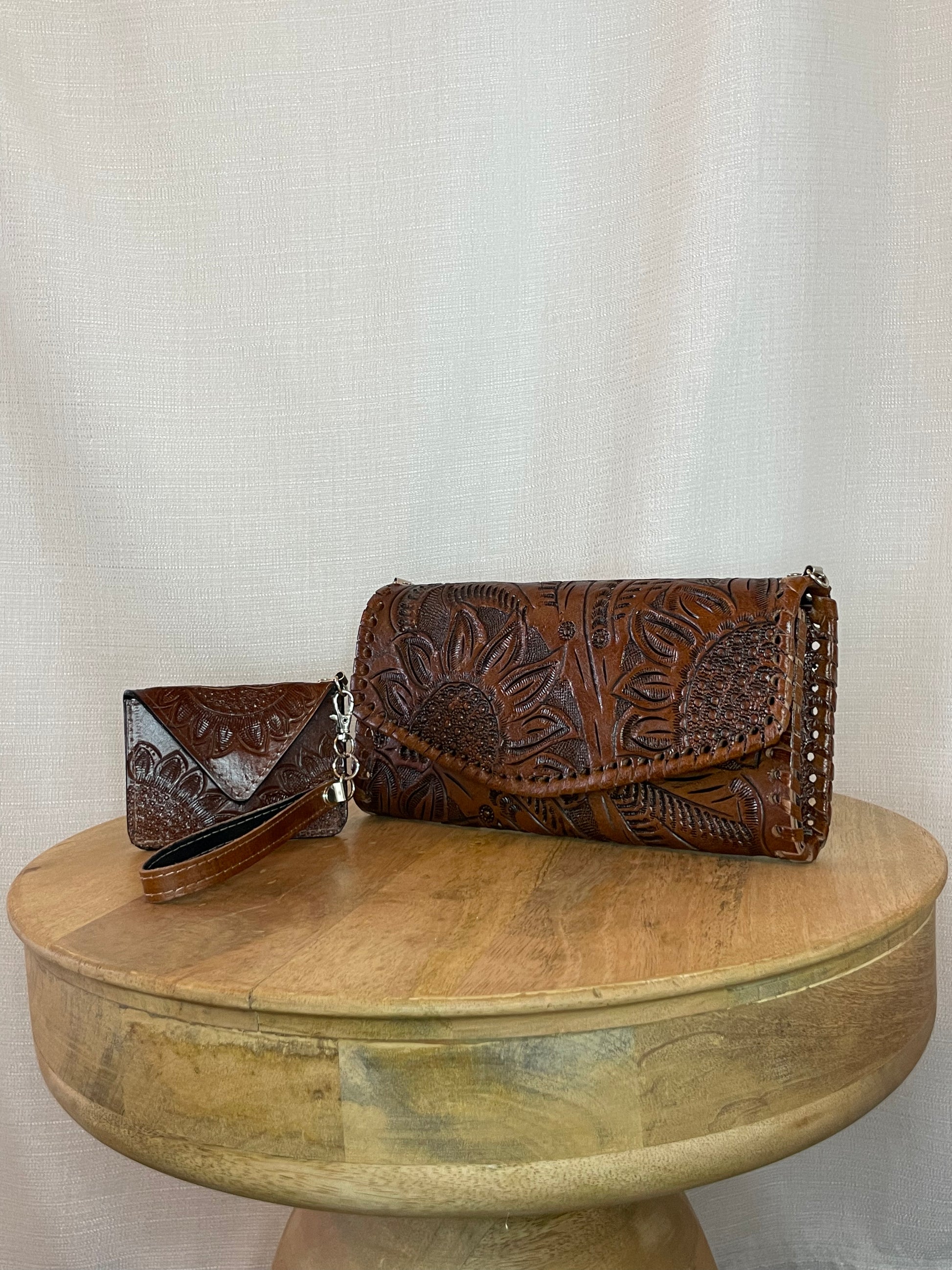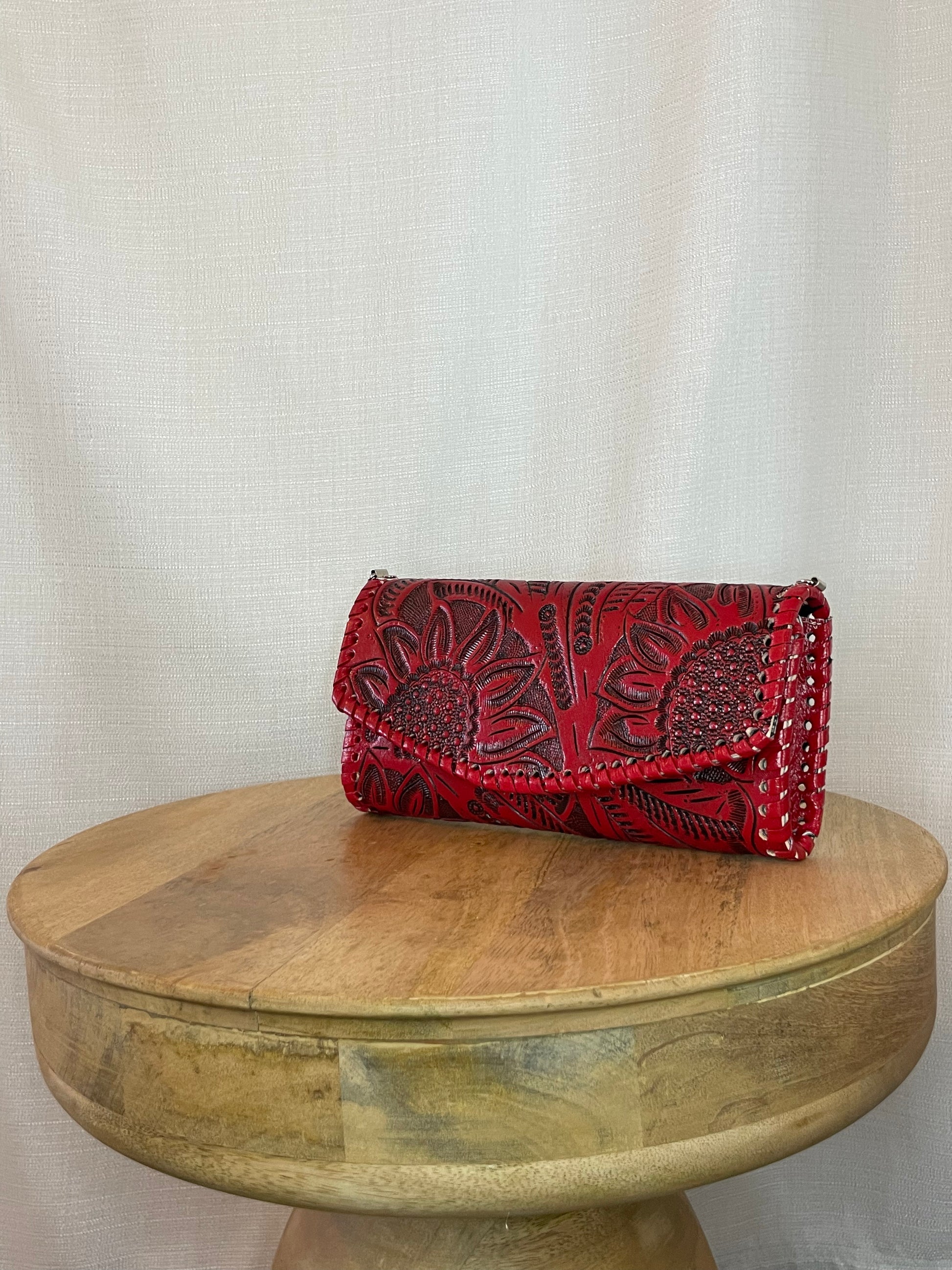 Resalta con esta cartera de mano hermoso de piel/vaqueta. Hecho a mano por artesanos en Guadalajara, Mexico.
