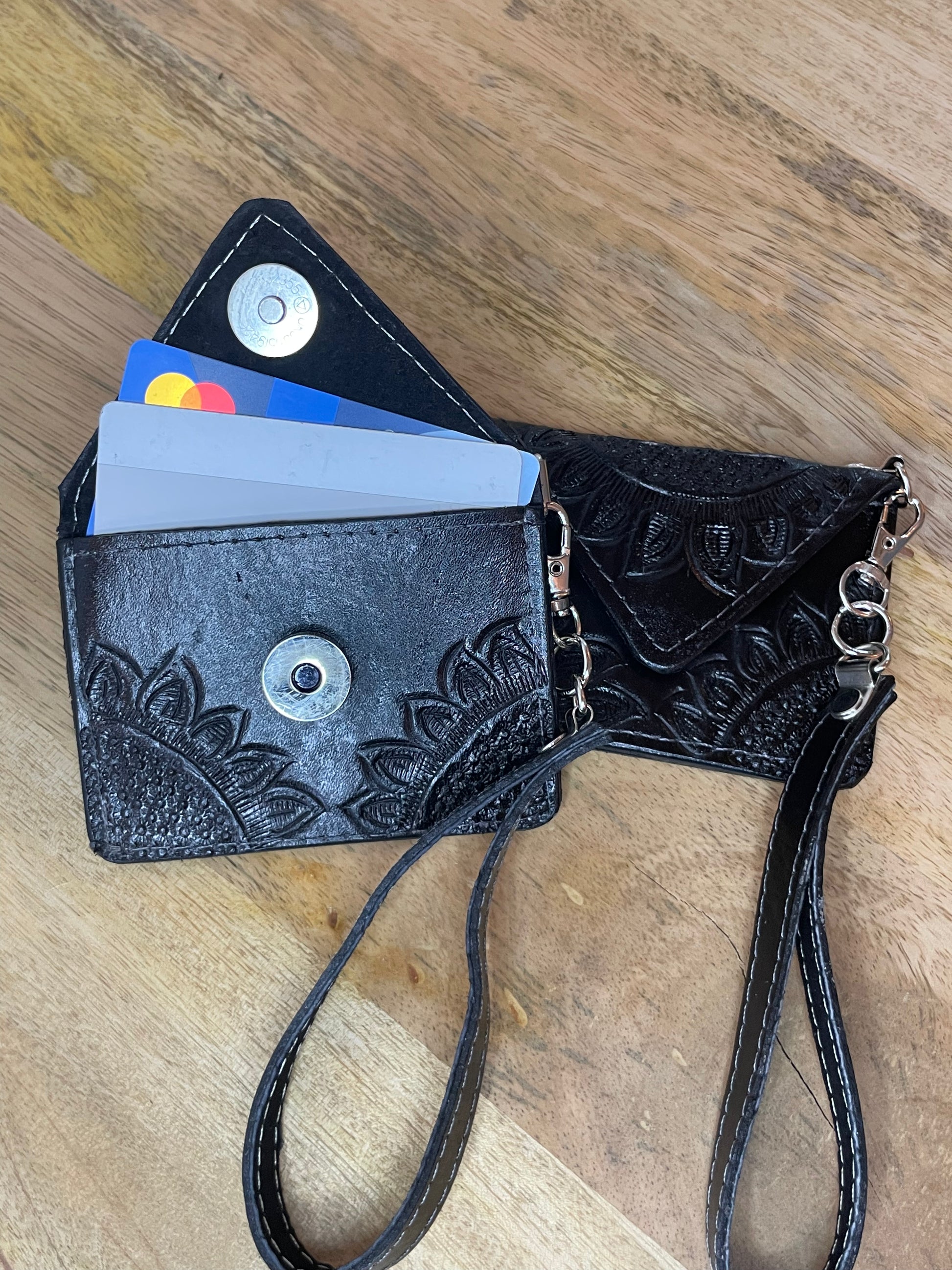 Resalta con esta cartera/tarjetero de mano hermoso de piel/vaqueta. Hecho a mano por artesanos en Guadalajara, Mexico.