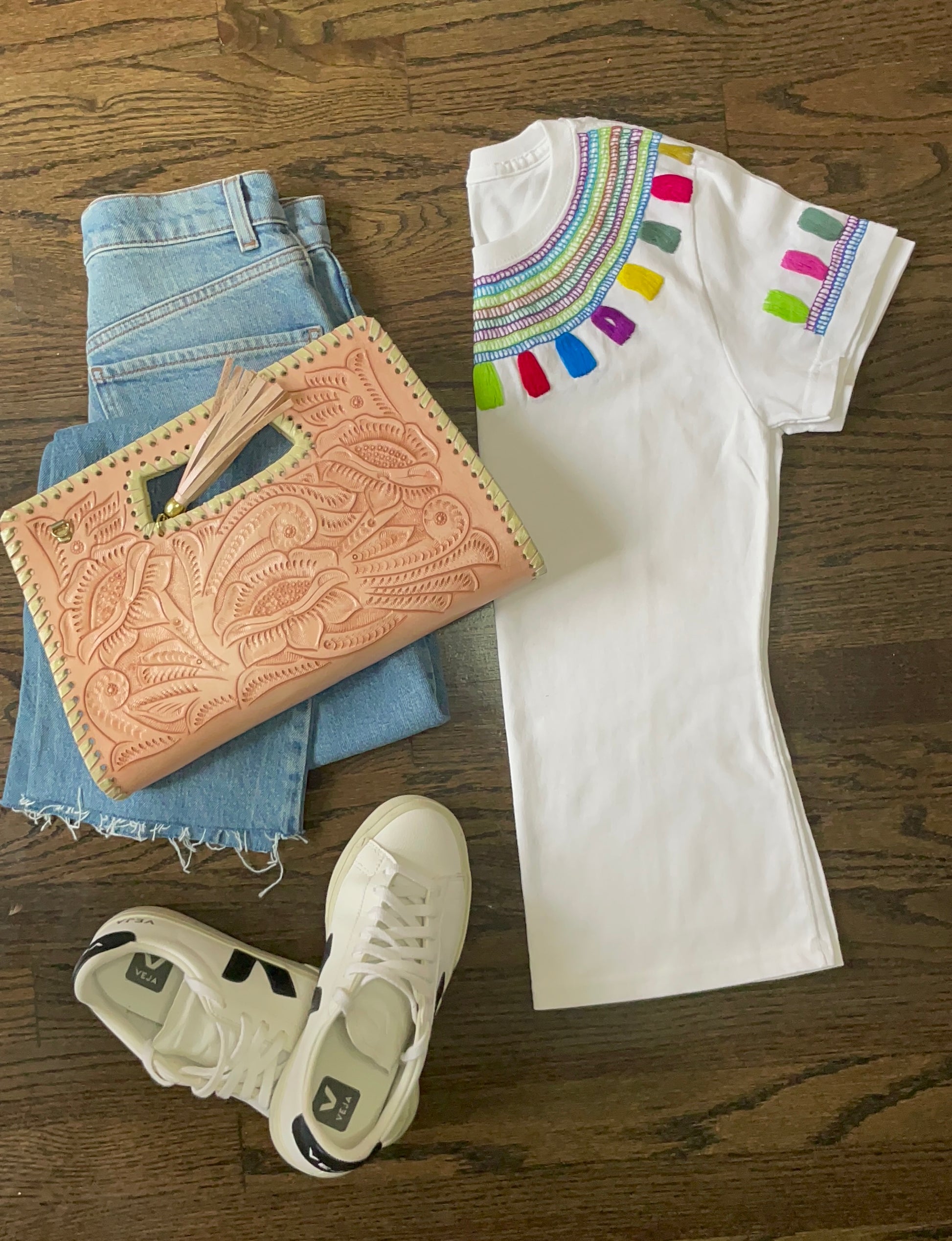 This Mayan inspired embroidered t-shirt is truly one of a kind. This is sure a t-shirt that can be worn for everyday activities or styled for a fun summer night. Embroidery colors and style is truly unique. Subtle traditional Mexican colors. Hand embroidered by Mexican artisans.