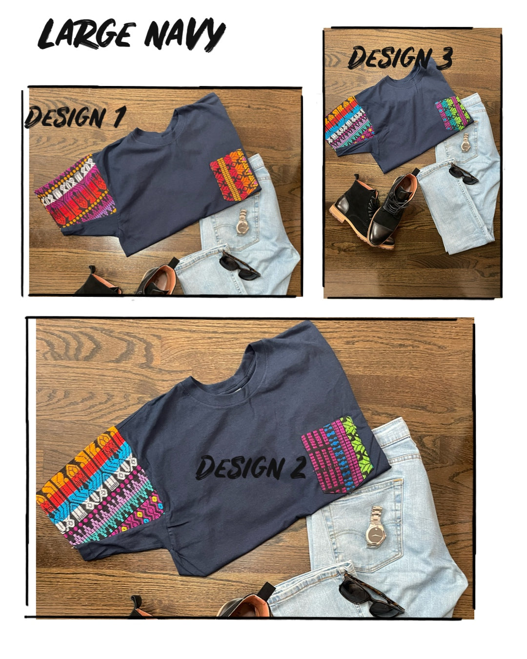 Navy Crew Neck Mens T-Shirt, 100% cotton t-shirt, hand embroidered by Mexican artisans. Subtle traditional bright Mexican colors. The embroidery in right sleeve and packet make this t-shirt truly one of a kind that can be worn for special occasions or on a daily. The colors and design of the embroidery makes this simple white tee stand out.